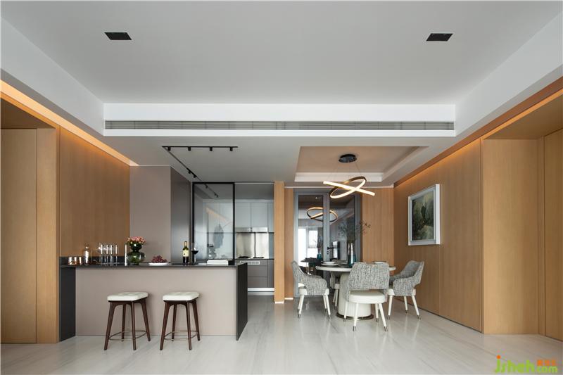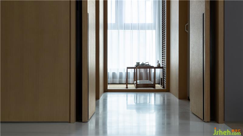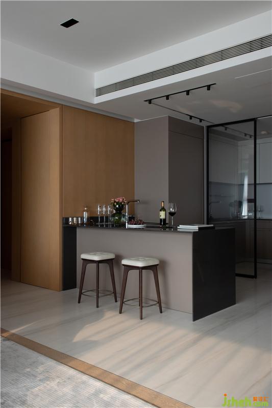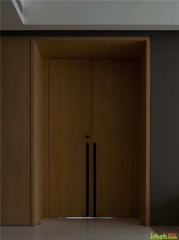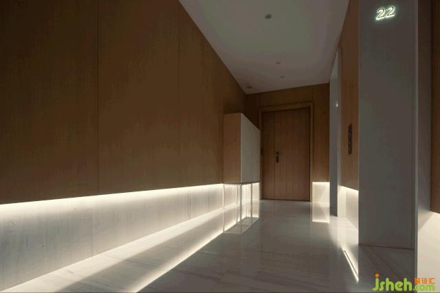 在入門處,從電梯廳走出,可發(fā)現(xiàn)鞋架與空間渾然一體,豪宅設(shè)計師特意地將鞋架抬高,便于房主進(jìn)出門脫換。人為地將鞋柜木飾面與墻面統(tǒng)一,簡雅而不失格調(diào)。