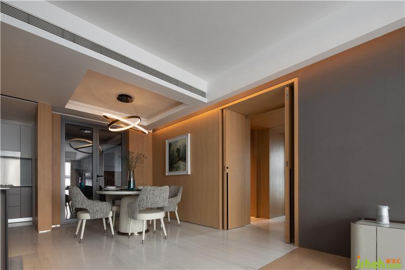 餐廳作為家庭情感交流的重要場地,減去了繁復(fù)的裝飾,天然木材和白色大理石圓臺桌營造出融洽舒適的生活意向。在就餐的同時也構(gòu)建起了人們的各種想象,提升了生活情調(diào)。