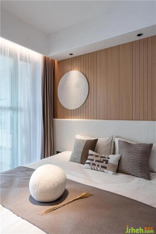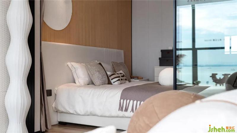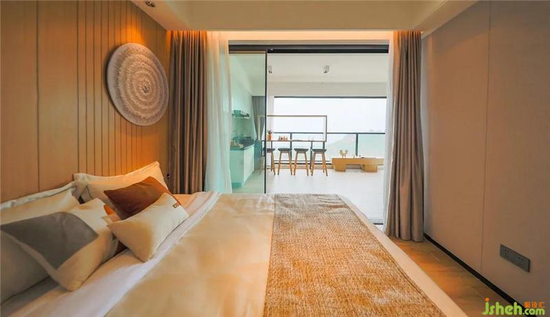 臥室的空間提取了沙灘、土、巖石中的米色和咖色,搭配掛在墻上的立體海沙藝術裝飾畫,加強視覺,讓人心中盛滿溫柔曼妙的感官。