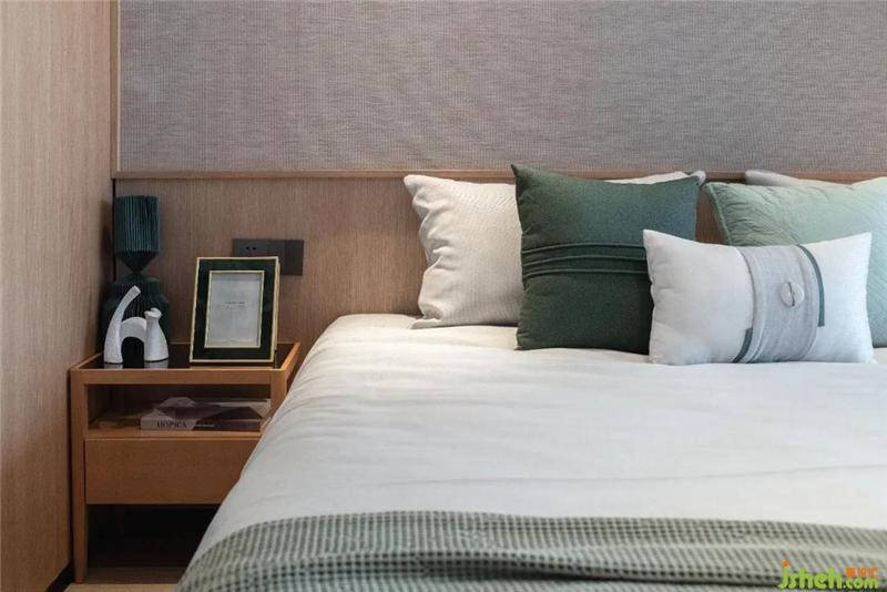 臥室的背景墻采用淡黃色的藤編織物,與清雅的綠色調床品形成對比,不論是色調還是織物都不約而同營造出了舒適慵懶的氛圍感。