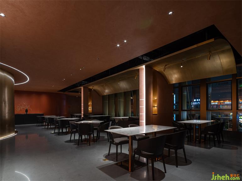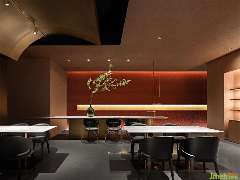 知嘛健康成都春熙路店餐廳設(shè)計(jì)位于空間二層。藝術(shù)涂料色調(diào)壓暗,自然形成的斑駁肌理在迷離光影下浮動(dòng),時(shí)間的灰塵灑成一層磨砂質(zhì)感的金,富于重量的黃銅拉出輕盈流動(dòng)的弧,在垂直空間創(chuàng)造出層疊變幻的視覺底色。