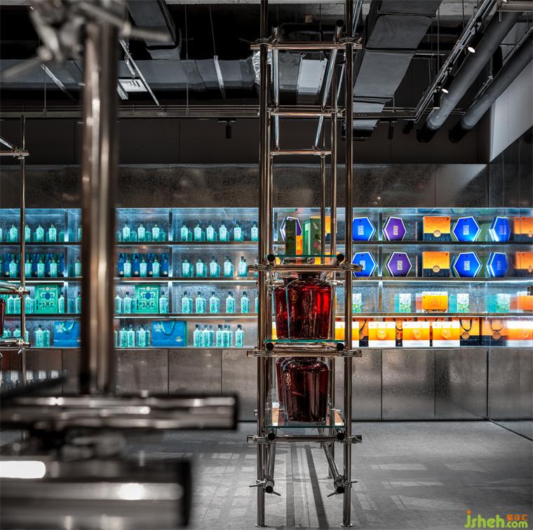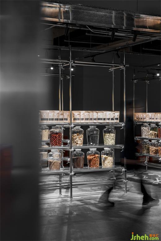 裸露的屋頂與大量鋪設(shè)的銀色腳手架沿用于整個空間,粗糲的原始感祛除了一切裝飾性雕琢,直播基地設(shè)計空間功能全部由材料簡潔的幾何構(gòu)成直接實現(xiàn)?;貧w本源的真實和拙樸也與同仁堂藥食之源互為襯托映照。