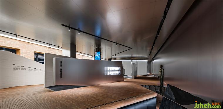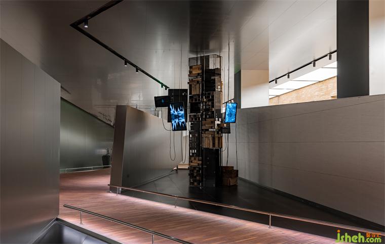 黑色鏡面與不銹鋼天花打造出空靈質(zhì)感,使人沉浸其中,恍若進入另一番探險。參觀大廳設(shè)計疊錯的折線、轉(zhuǎn)換的視角在多維線性空間展開。數(shù)字化生產(chǎn)工藝實景和智能化顯屏櫥窗二次折射元宇宙的光影,輝映著綿延在時空中的品牌精神。