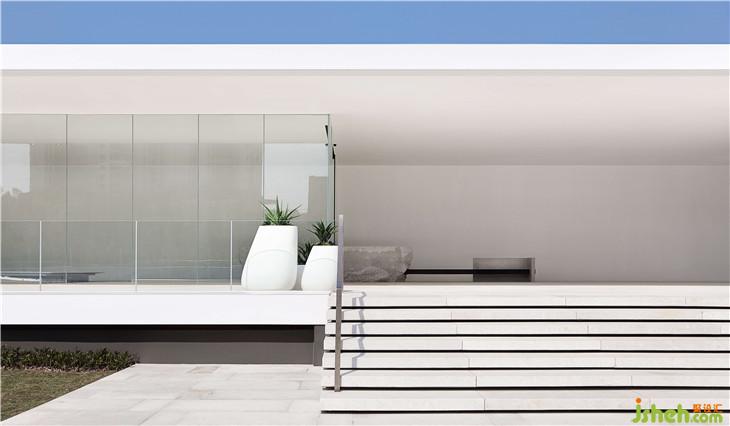 一座純白色的柏拉圖式的極簡主義單層建筑,