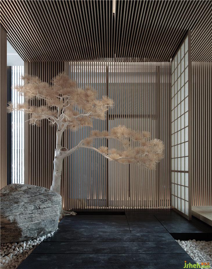 落于接待大堂左側(cè)的VIP休憩區(qū)的木柵格韻律舒緩寧?kù)o,凈白的枯樹(shù)與細(xì)細(xì)分割的光影掩映成趣。舉步入內(nèi),一方看得見(jiàn)遠(yuǎn)處風(fēng)景的空間。窗外的自然景觀和室內(nèi)的日式枯山水,似乎就在這個(gè)“小木盒”中喁喁對(duì)話。