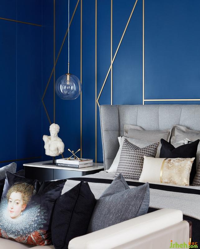 其他起居空間中,以舒緩、通透和柔和為原則,設(shè)計師所采用的藍(lán)色和綠色各有層次,利用不同的織物搭配出不同的氣質(zhì)。一條條金色折線穿行其中,如同一個引索,串聯(lián)起不同有關(guān)生活、藝術(shù)的夢幻。