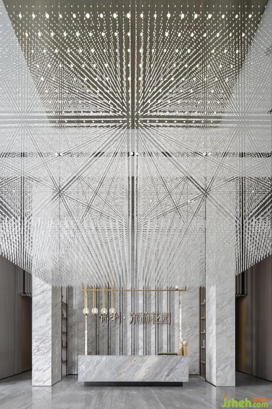 進入空間,水晶吊飾舒展垂落。作為空間語言的一部分,其無數(shù)線條徑向重復的陣列造型,連同剔透的材質,于輕盈迷幻中協(xié)同了某種震撼感。