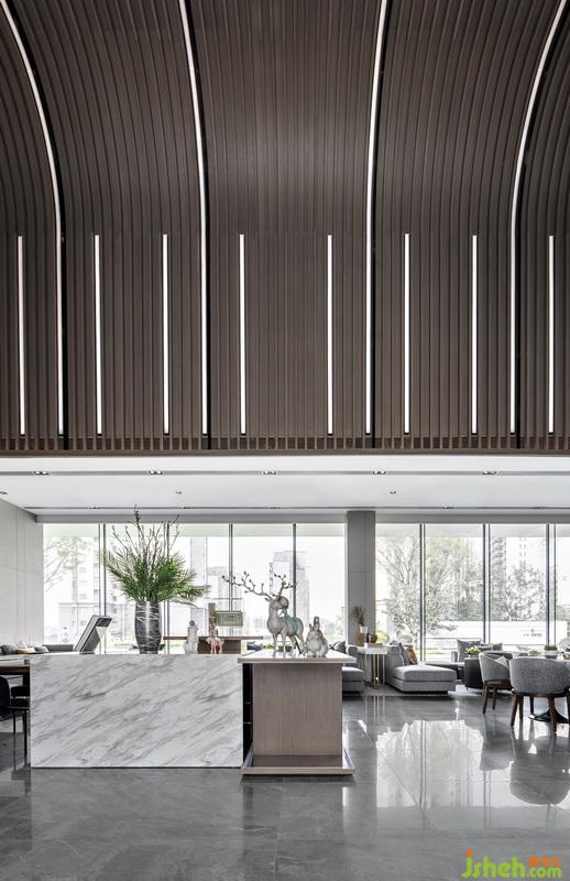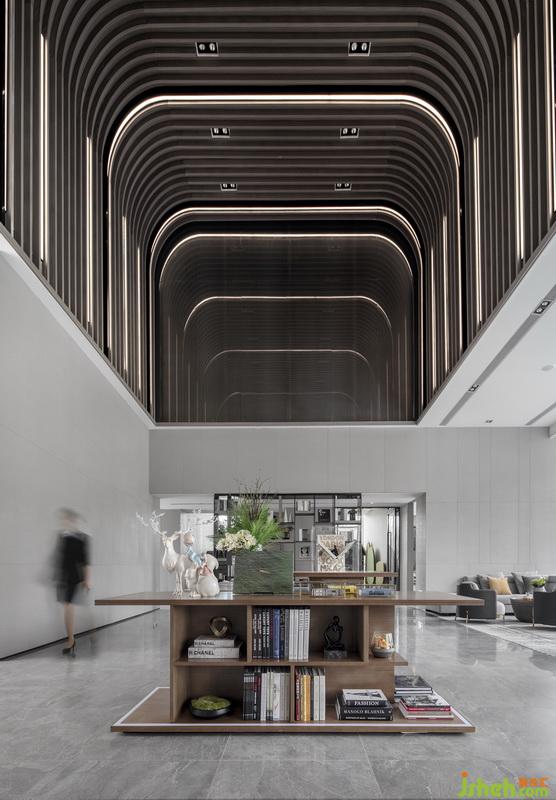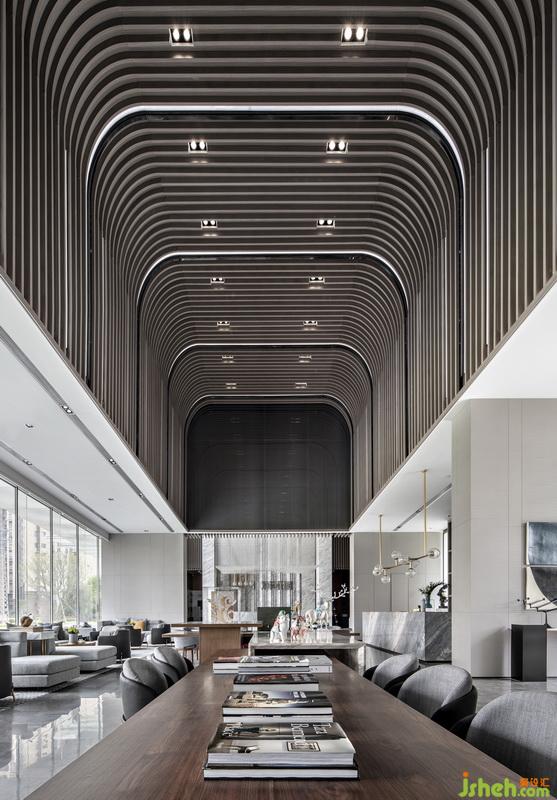 環(huán)顧左右,巨大的中空結構映入眼簾,盡顯建筑高度所帶來的視覺沖擊力,高挑渺遠。木格柵間隔狹長的燈帶的造型產(chǎn)生了美妙的曲線韻律,使得整個天花造型仿佛蕩漾出了層層細膩的漣漪。