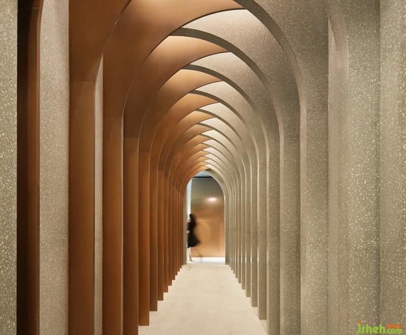 通往樣板間的藝術走廊也充滿巧思。半圓互相疊合,利用錯覺的效果形成一個個陣列式排布的拱門,打造又一個優(yōu)雅的符號。藏燈的設計使光纖柔和均勻,讓人置身其中,宛如走入一條神圣的走廊,穿越到遠方。