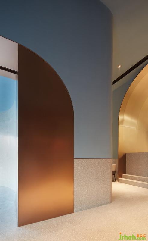 其次則是空間連貫性,室內設計師談到了一個小細節(jié):“如果仔細觀察,可以看到在1米高度的地方都有一條黃銅腰線貫通整個洽談空間,前廳水吧臺、卡座沙發(fā)、就餐區(qū)中央石桌三者的高度都統(tǒng)一在1米的高度。同理,3米處也有一條高度線聯通吧臺的天花、門洞的高度、卡座上方的造型?!?