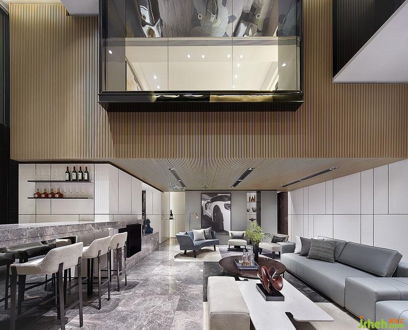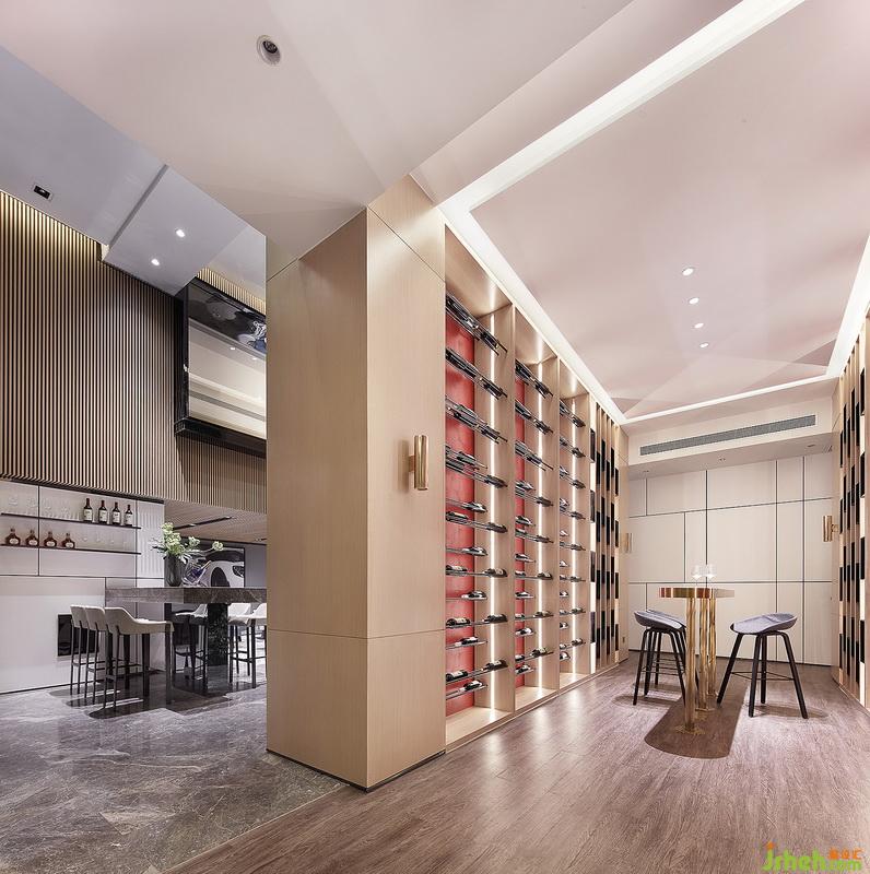 地下二層的聚會(huì)大廳,更多用以接待親友,呈圍合式的MINOTTI組合家具,可根據(jù)聚會(huì)的形式和人數(shù)有機(jī)組合??臻g中大理石地面鋪裝延伸到品酒吧臺(tái),白色塊面墻身和木飾質(zhì)感構(gòu)成新的視覺體驗(yàn)。