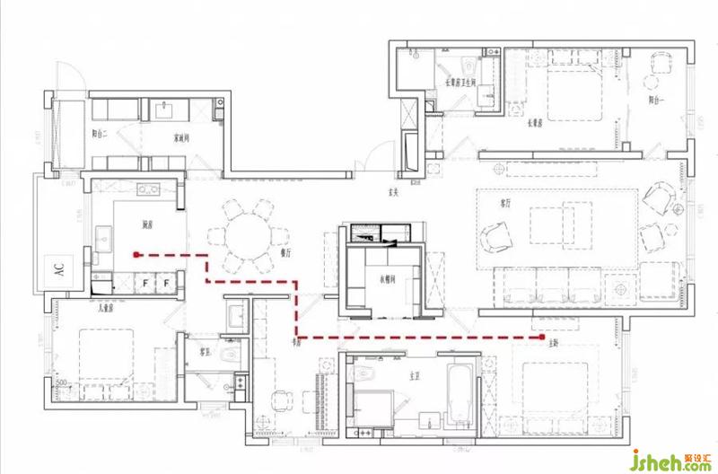 考慮到主人會因工作早出晚歸,有可能影響其他家庭成員的休息,設(shè)計上為家庭成員劃分動靜分區(qū),活動區(qū)域和生活區(qū)域互不干擾,減少噪音對其他家人的影響。