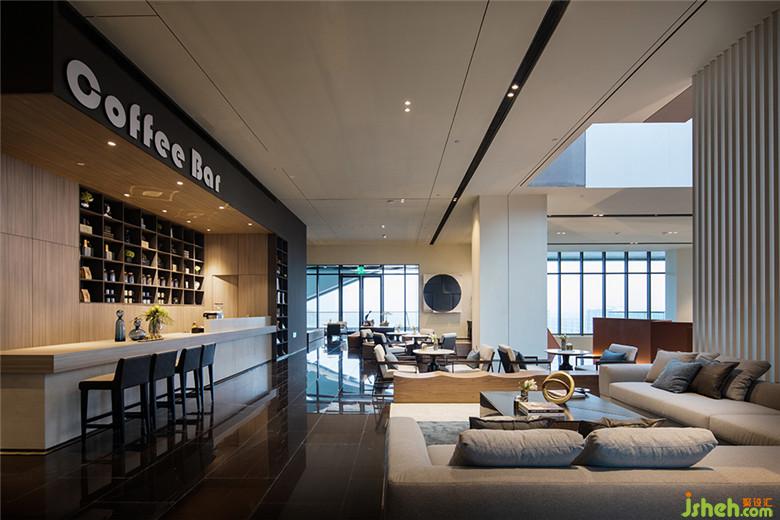 LOUNGEBAR位于接待大堂的中心,保留了空間整體性同時,巧妙的將洽談區(qū)空間與沙盤區(qū)域分隔開來,保證參觀者的動線互不干擾。