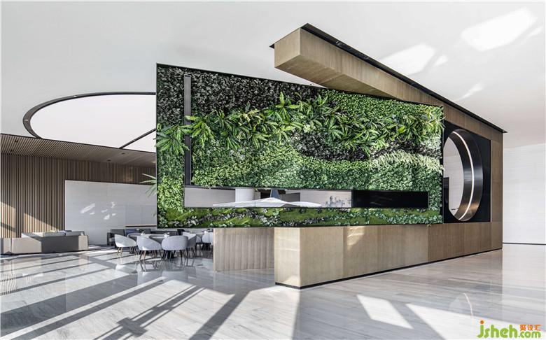 水吧區(qū)中的綠植墻欣欣向榮,對角線走勢和框景的造型不露痕跡地切割功能區(qū),打破原來空間的沉悶。從其中一個門洞延伸而來的藍色藝術吊飾,與另外的海螺型雕塑相匯合,形成了一次連續(xù)的視覺體驗。設計師借助多個藝術裝置,完成了入戶-深進的故事線設計,可謂巧妙。