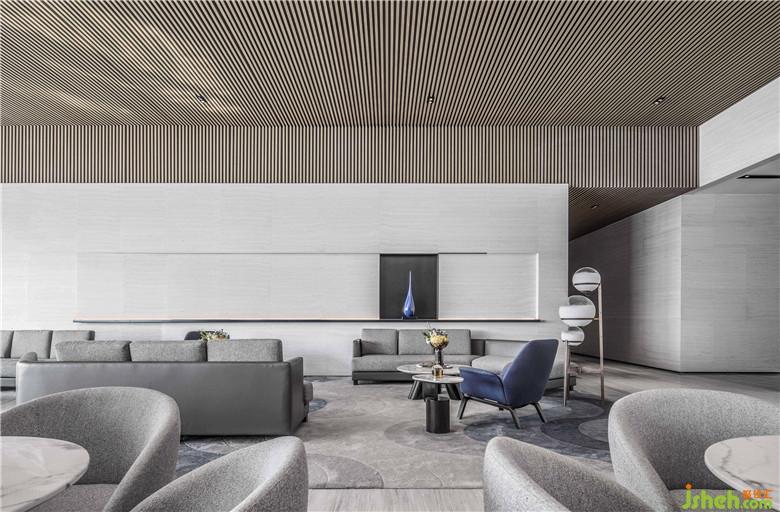洽談區(qū)放大了“海洋”元素,藍色的地毯模擬出海上微瀾的生動場景,而巨大的連排落地玻璃窗則把近在咫尺的、盛大的海洋景色“借入”室內,讓人如迎海風,心曠神怡。