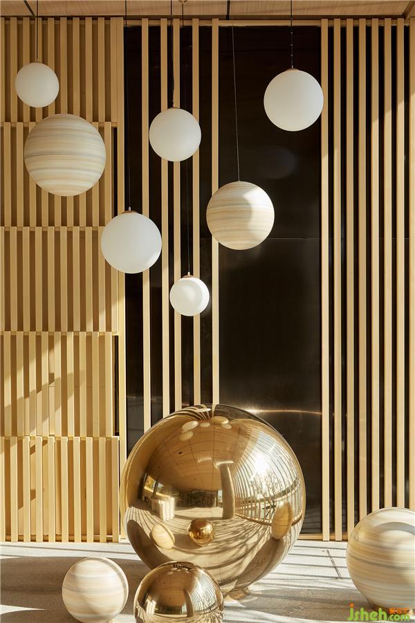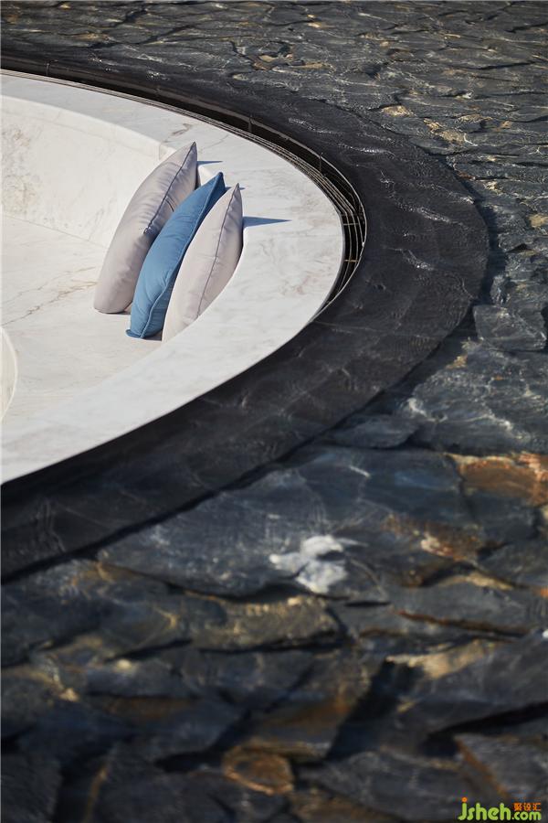 戶外的粼粼波光不再只是單調(diào)的水景。設(shè)計(jì)師采用溫潤的石材和地木,開辟出星點(diǎn)幾個(gè)、如漣漪般蕩漾開去的下沉式沙發(fā)區(qū)。不拘泥于室內(nèi),而是把社交場(chǎng)合延伸到室外以更貼近自然,創(chuàng)造豐富多元的場(chǎng)景。人與人之間、人與環(huán)境之間在開放式的空間彼此呼應(yīng)。