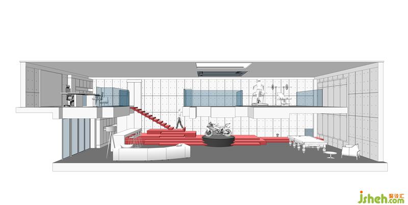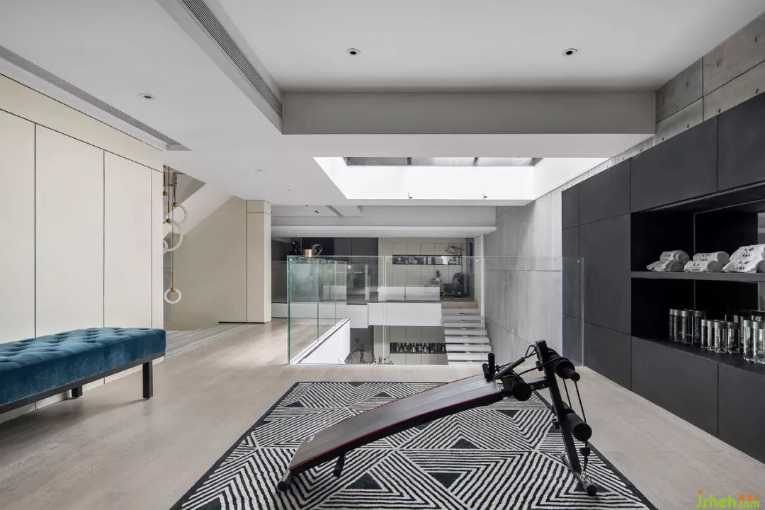 從地上一層到夾層,是專屬的健身區(qū)域,騎手造型多處隱喻居者的興趣。健身區(qū)天窗自然光照聚焦,在這里運(yùn)動,仿佛置身大自然酣暢淋漓揮灑汗水。 負(fù)一層增加樓梯通向夾層室內(nèi)空間的唯一動線,保證了空間的專屬性。設(shè)計師將原車庫位置作為室內(nèi)空間使用,增加了居者活動空間的同時兼顧了工作思考的私密性。