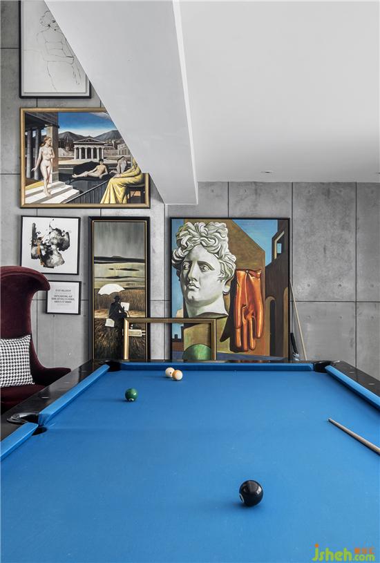地下一層為休閑娛樂空間,酒吧與雪茄區(qū)一體而成,延伸到家庭聚會區(qū),塑造了豐富的生活交流場景。燈光照射出的光線在此處跳躍,將吧臺區(qū)置身于隱約的迷離氣氛中。 一層天窗自然采光到地下,聚焦在機(jī)車展示區(qū),經(jīng)由金屬材質(zhì)強(qiáng)調(diào)線條感,塑造出輕奢的時尚感。臺球桌以藍(lán)色主基調(diào),搭配藝術(shù)背景墻,明快的藝術(shù)氣息撲面而來。居者在此紳士地運(yùn)動,與朋友交流,享受輕松洽談的氛圍。