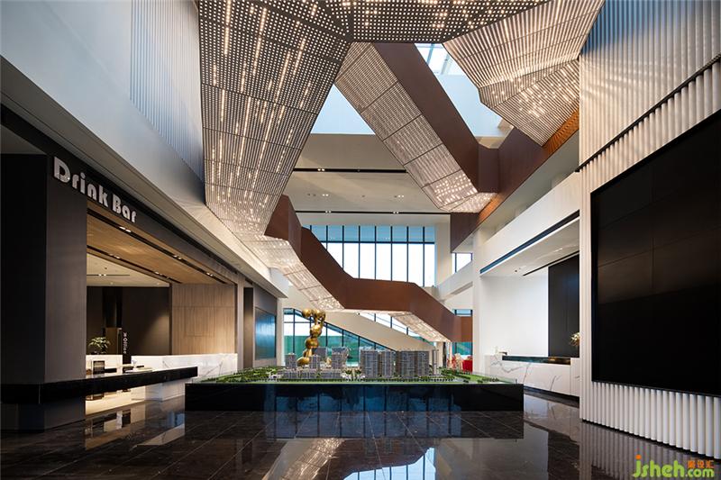 設(shè)計(jì)師以“探索之旅·云頂之城”為主題,結(jié)合項(xiàng)目,建筑、景觀、室內(nèi)一體化的體量,以“致敬美學(xué),尊重生活”為理念,錯(cuò)合的三層樓通過(guò)中空樓梯為橋梁,將項(xiàng)目空間分為接待區(qū)、沙盤展示區(qū)、洽談區(qū)、簽約區(qū)等體塊。售樓處設(shè)計(jì)