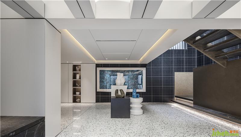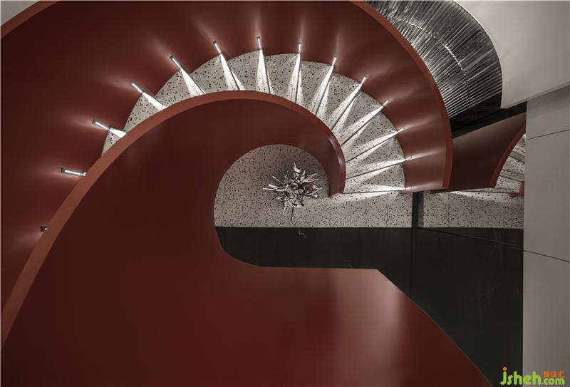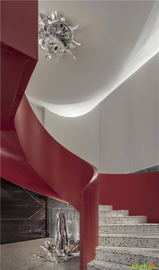 旋轉(zhuǎn)樓梯改為鋼結(jié)構(gòu)以便塑造出更為輕盈的造型。參照跳水運動員跳水的姿態(tài)而創(chuàng)作的原創(chuàng)藝術(shù)作品《上善若水》分天地兩部分,借旋轉(zhuǎn)樓梯彼此呼應(yīng),遙遙相連?!疤焖迸c“地水”的結(jié)合,平衡陰陽,包羅萬象。