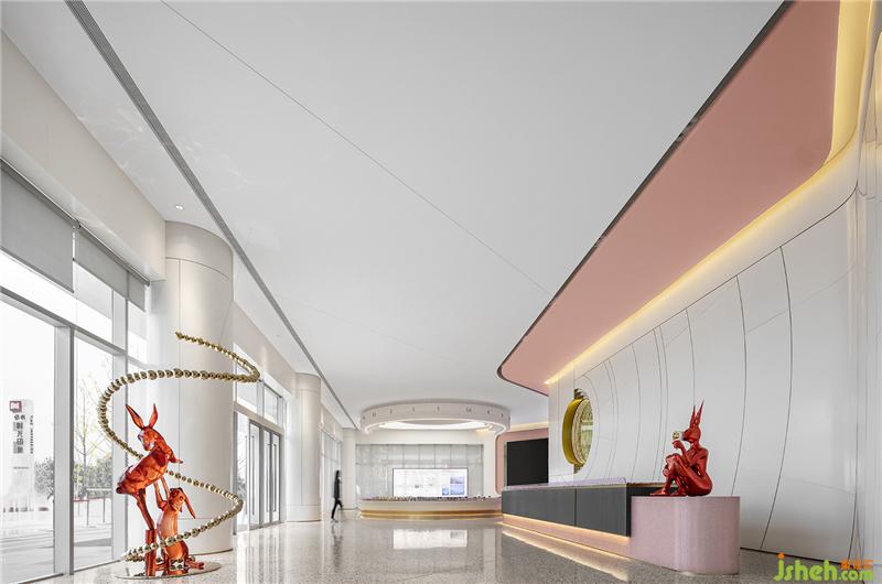 過道的藝術(shù)裝置別有趣味,紅色的兔子雕塑為空間注入盈盈活力。兔子代表我們內(nèi)心制造出的美妙夢境,而前臺的鏡頭記錄每段時光的美好印象,與前臺主題“時光印象”相呼應(yīng)。