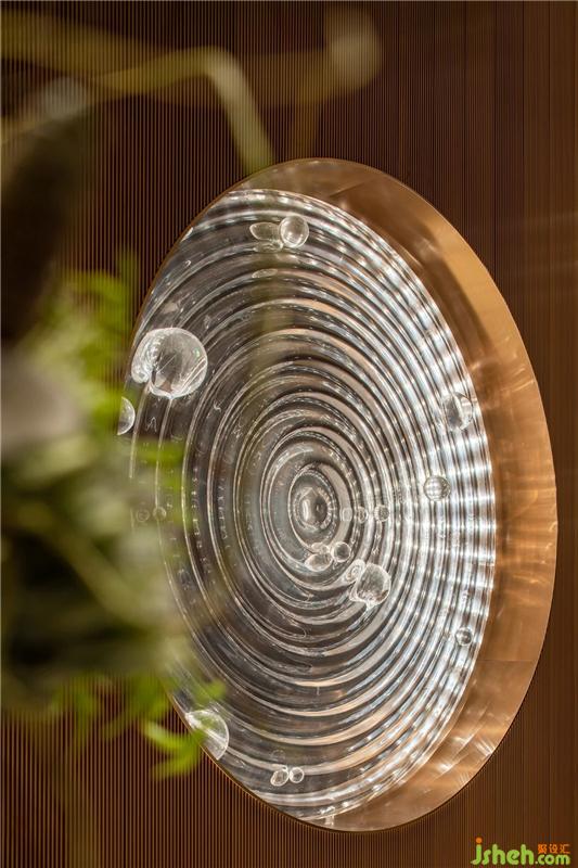 緩緩步入前廳,開敞宏闊的空間映入眼簾。日光初現(xiàn),晨露落于水面泛起漣漪,層層蕩漾,以亞克力的材質(zhì)定格于此,讓空間頗具動感,引人入勝。