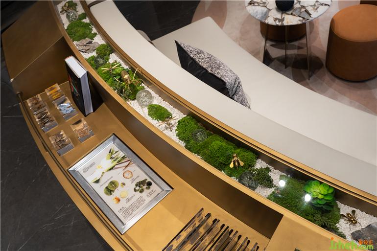 洽談區(qū)為營造博物館的沉浸式體驗感,將空間打造為知識的載體,特地設(shè)置了一處獨立互動島嶼,頂部的天花造型作為主要空間的虛隔斷,在各式各樣的標(biāo)本藝術(shù)裝置下詮釋優(yōu)美的生態(tài)環(huán)境。