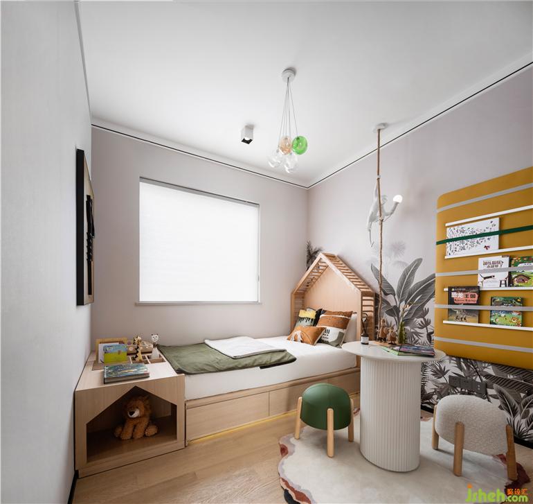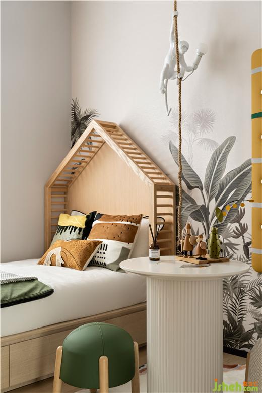 南昌樣板房設(shè)計以“動物王國”為主題打造兒童房,馬卡龍配色營造出鮮活的熱帶雨林氛圍,沉穩(wěn)的綠色調(diào)山林,在動物的守護下承載著小小山林之主的美夢。