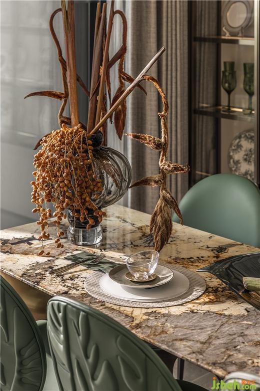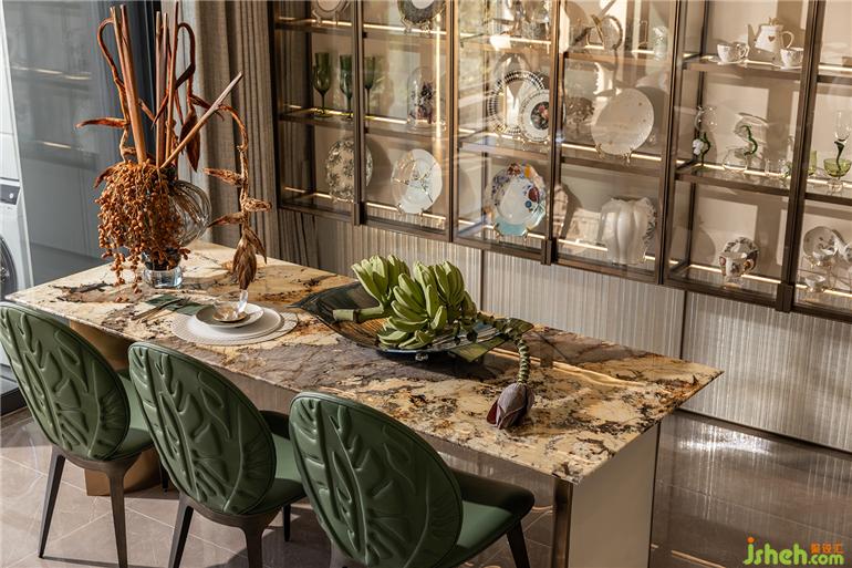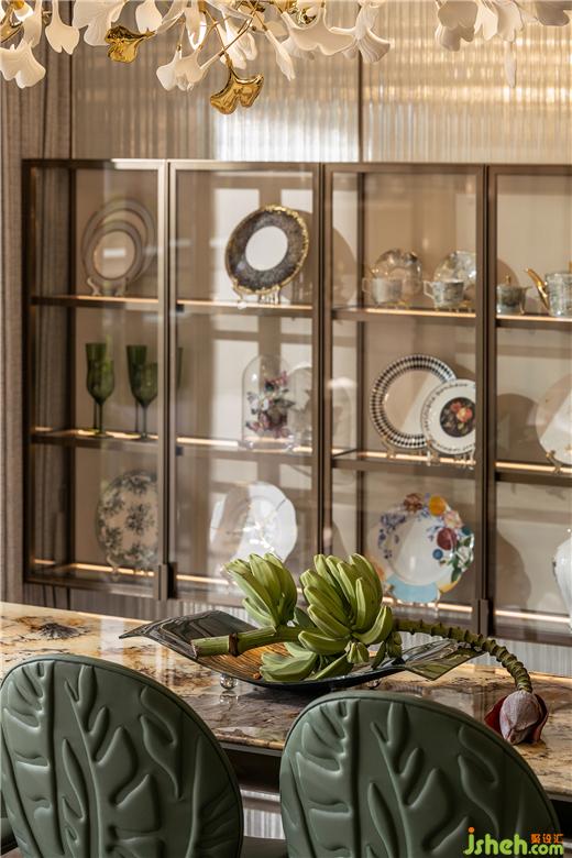 福州樣板間設(shè)計(jì)精致的瓷器藝術(shù)品,在陽光透過茶色玻璃的照耀下明亮動(dòng)人,一片片銀杏葉擬態(tài)組成的花燈,白金交織,頓生一室典雅。