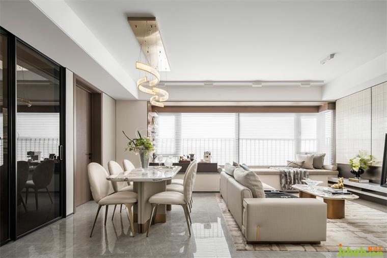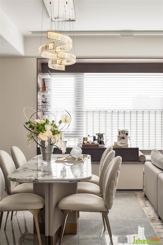 在“少即是多”的原則下,餐廳的燈具選擇了優(yōu)柔線條的玻璃質(zhì)感,金屬鑲邊,杭州保利樣板房設(shè)計勾勒別致的優(yōu)雅。
