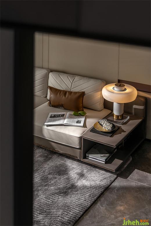 中山保利樣板間設計選用可移動的小茶幾,令中央活動空間更顯靈活寬敞,優(yōu)雅的金屬幾何體構造帶來藝術氛圍,與圓柱體臺燈相和諧,靜靜在書頁文字里找回深度閱讀的耐心。