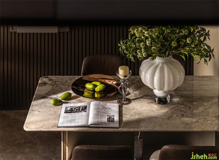 燈具選擇在一定程度上決定家的品味與舒適度,圓形、菱形與直線的幾何組合利落勾勒出雅致,深色木飾面作為餐廳的背景墻承載了吧臺的功能,與椅子的顏色呼應,凸顯成熟氣質。