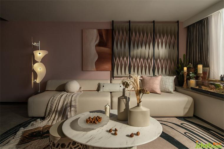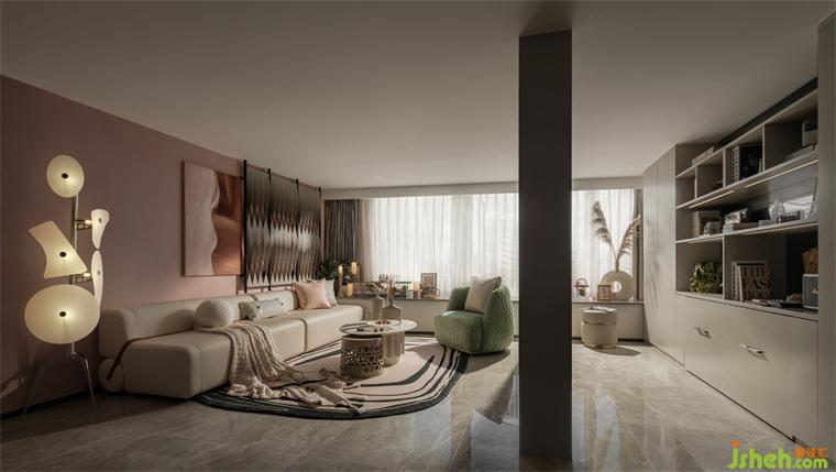 米色系用在室內(nèi)溫柔得恰到好處。廣州公寓設(shè)計(jì)莫蘭迪粉的墻面和薄荷綠絨面沙發(fā)的加入使色彩更豐富。