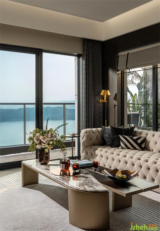 別墅裝飾拉扣沙發(fā)與石木拼合茶幾詮釋了不同材質(zhì)、形狀之間平衡的重要性。