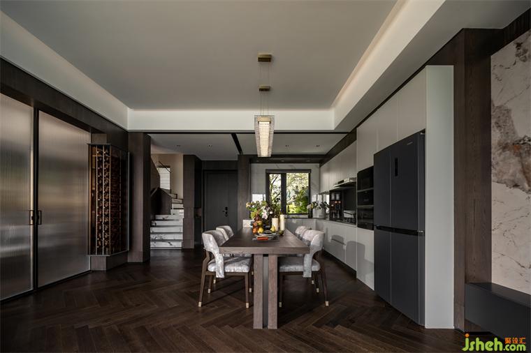 餐廚成為客廳的延展,島臺(tái)的加入創(chuàng)造更多可能性,別墅裝飾隱藏酒柜和柜邊燈充滿對(duì)生活細(xì)節(jié)的關(guān)懷。