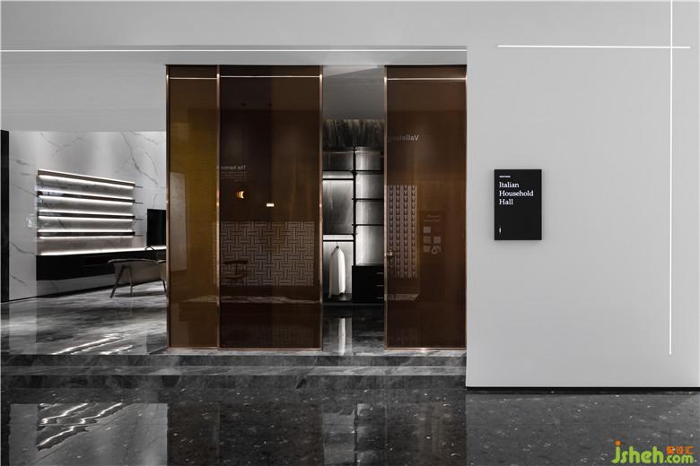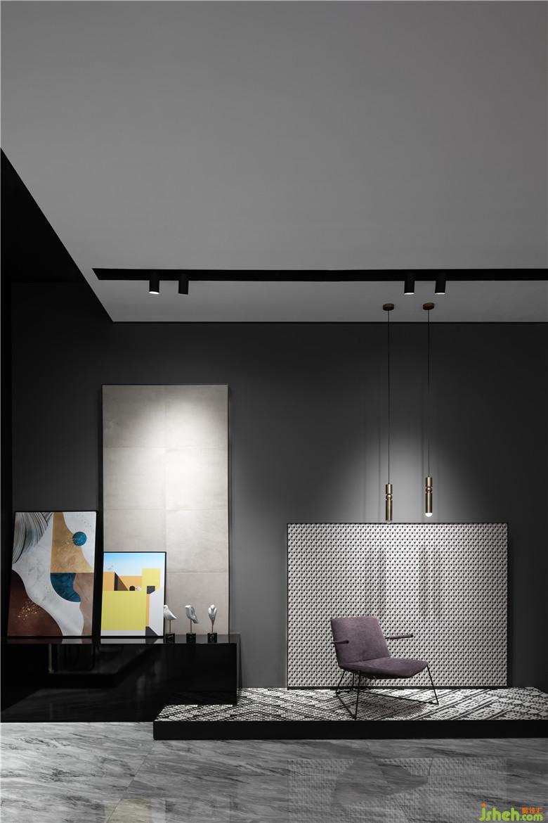 選材區(qū)以產(chǎn)品展示為核心,通過疏密有致的幾何體塊序列進(jìn)行敘事。非對(duì)稱空間是在空間維度上尋找平衡點(diǎn),是相對(duì)復(fù)雜且豐富的,空間體量和疏密有致的幾何體塊之間的關(guān)系形成了空間獨(dú)有的藝術(shù)形態(tài),在細(xì)節(jié)處理上,對(duì)材料的對(duì)縫,收邊,比例都經(jīng)過細(xì)致的推敲和設(shè)計(jì)和精磨精切。追求品質(zhì),而這就是建筑對(duì)使用者體現(xiàn)出的尊重感。黃銅等金屬材質(zhì)低調(diào)地出現(xiàn)在空間中,使得室內(nèi)的寧?kù)o氛圍多了些許豐富的變化。而木材與石材的運(yùn)用,亦使空間多了些溫潤(rùn)及細(xì)致的表達(dá)。