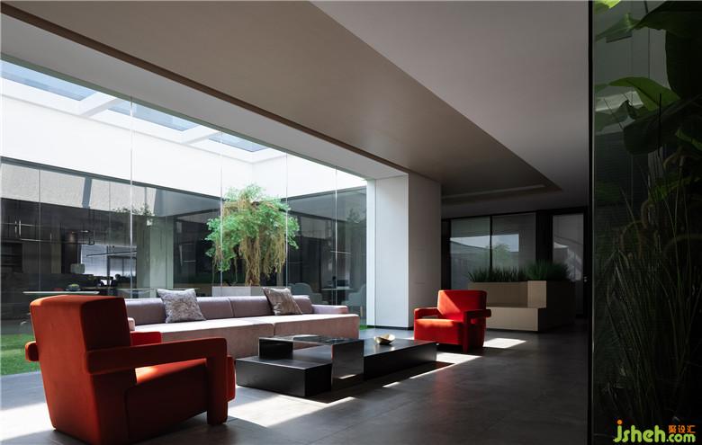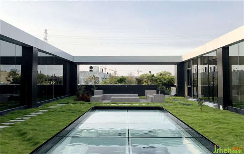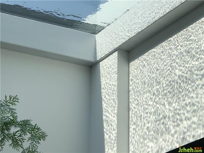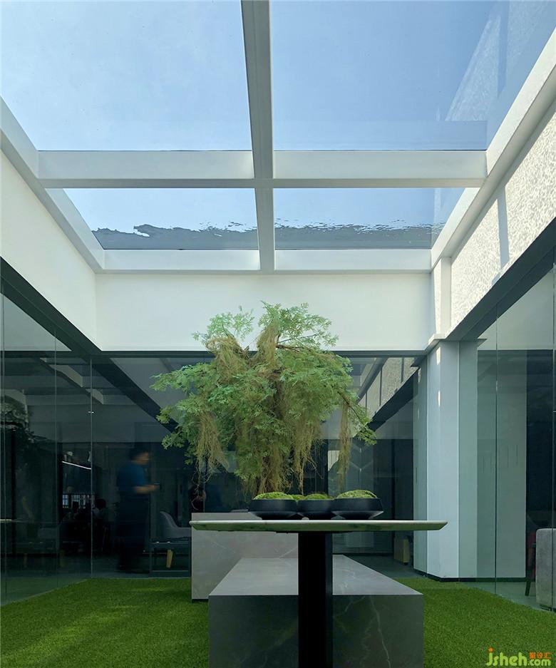 辦公區(qū)遵循人性化的空間表現(xiàn)形式,從心理角度出發(fā)建立員工對(duì)空間乃至企業(yè)的認(rèn)同感。以玻璃圍合的中央庭院成為設(shè)計(jì)亮點(diǎn),二次改造的天窗同時(shí)又是一座淺水池,陽(yáng)光透過(guò)水面射入庭院,人與自然便在光影蕩漾之間實(shí)現(xiàn)了巧妙的融合。