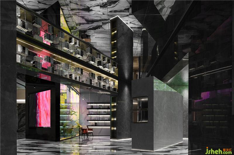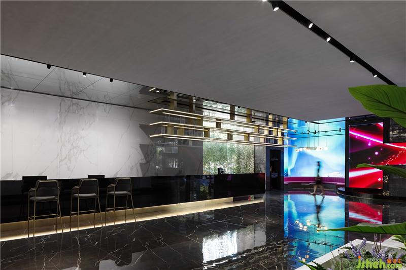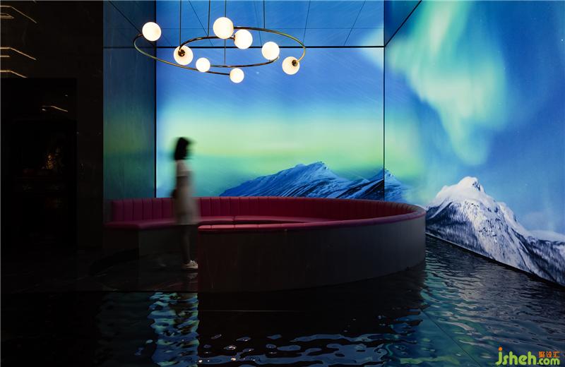 入口休閑區(qū)穿插著多媒體的形式以呈現(xiàn)最佳的展示效果,借助這種方式,讓客戶在虛擬場景空間中慢慢享受科技帶來的全新感受。漫步其中,伴隨輕柔音樂律動而產(chǎn)生迷離虛幻的動感畫面,虛擬的極光映襯在水面上,在空間中融合科技元素,創(chuàng)造出獨特的沉浸式場景體驗,勾引人們對未知世界的探索欲望。總部展廳設計