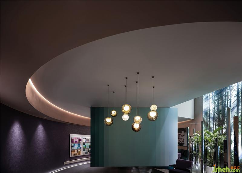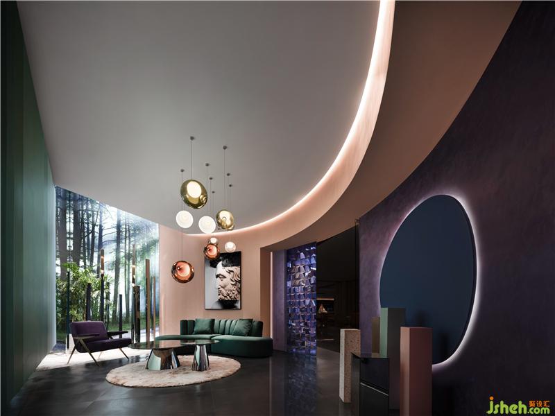 步入大堂,懸吊的斜形墻體將空間分為前庭后院,弧形墻面將二者自然的融合在一起,空間中通過曲和直的對比,前和后的相隨,有和無的共生,讓空間的夢幻氣質(zhì)進一步強調(diào),天花上的“氣泡燈”墻面的漸變色彩,串聯(lián)起不同的功能空間,確保整體敘事的一致性;隨意流動的路線中隱匿著各種結(jié)構(gòu)設(shè)備,空間的兼容性和通達(dá)性得以保障;淡粉色肌理漆保證了空間純度,只要出現(xiàn)另一種色彩,即可退居其后,成為一種襯托色。