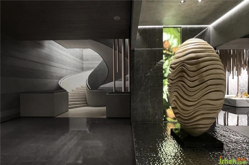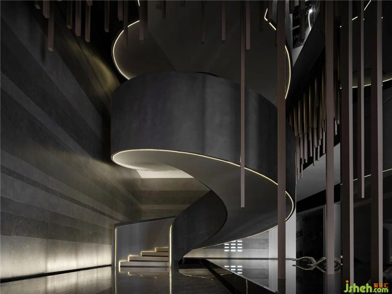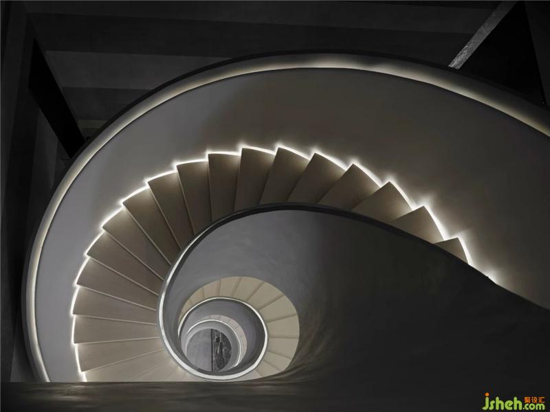 拾階而上,以灰色水磨石墻面以及微水泥質(zhì)感的樓梯扶手為主調(diào)的樓梯間表達出空間的自然寧靜,蜿蜒而上的旋轉(zhuǎn)樓梯將人的視線向上延伸,榕樹枝干沿著空間的間隙向上穿插,弧形曲面和垂直線在空間里相互對比,這種沉浸式的空間氛圍極大的調(diào)動參觀者的好奇心,希望能更進一步的一探究竟,設(shè)計師在空間表現(xiàn)上除了強調(diào)視覺的美感更希望挑動觀者的心理情緒。