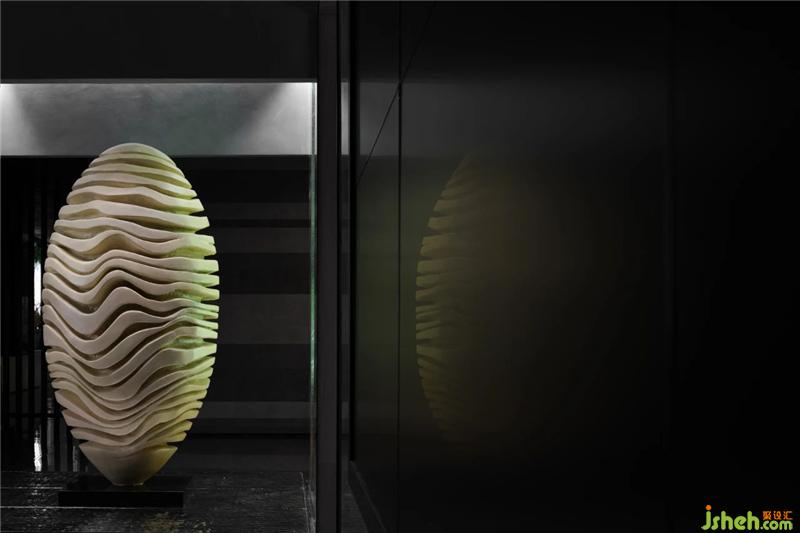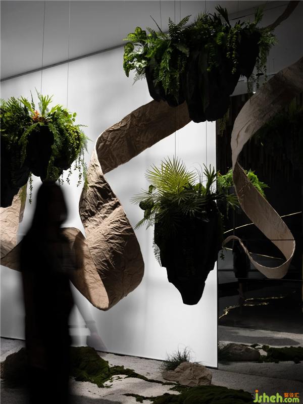 二樓的空間以“孕育”作為空間主題,首先,生態(tài)的環(huán)境植物的繁衍給生命的誕生提供了基本條件。其次,關(guān)于生命的起源有不同的解讀,中國古代有一種說法是“腐草化繭,破繭成螢”,意思是生命源于螢火蟲的“蟲繭”。老子在道德經(jīng)里講生命是由一種“ 混沌之氣”混合而成,因此,設(shè)計師在空間營造了一個“蟲繭”裝置,以此代表著生命的孕育過程。