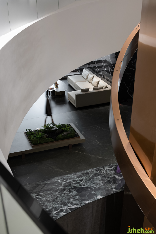 結(jié)構(gòu)的縱深通過光影的變化而漸次遞進(jìn),設(shè)計(jì)師通過將結(jié)構(gòu)體有序的分離重組,讓平面的墻體變成具有立體幾何美感的雕塑,既增強(qiáng)空間的結(jié)構(gòu)張力,也凸顯工業(yè)時(shí)代的精磨精切的工藝加工品質(zhì)佛山巖板展廳設(shè)計(jì)。