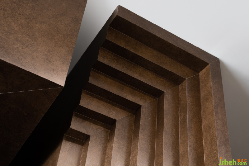 建筑原樓梯間本是一個(gè)平淡無奇的雙跑樓梯構(gòu)造,設(shè)計(jì)師刻意強(qiáng)化和凸顯的樓梯間的空間構(gòu)造,使樓梯間呈現(xiàn)出一種結(jié)構(gòu)美學(xué)體驗(yàn)感。材質(zhì)上選用赭紅色的銹鐵質(zhì)感的巖板搭