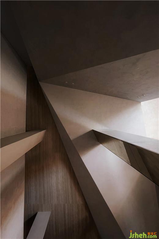 原建筑除了朝西面有窗戶,其他三面都是封閉空間。巖板展廳設(shè)計(jì)師對建筑結(jié)構(gòu)進(jìn)行優(yōu)化改造,特別是在展廳東面的轉(zhuǎn)角處打開一個(gè)三層中空天井,在三樓東面鑿開一扇窗,將一束陽光引進(jìn)室內(nèi),中空天頂采用倒三角的設(shè)計(jì),而朝窗外的斜面則使用了鏡面材質(zhì)。通過鏡面的反射作用,光線進(jìn)行了二次折射,使陽光穿過梁柱傾瀉進(jìn)來,使整個(gè)空間瞬間變得神圣起來。