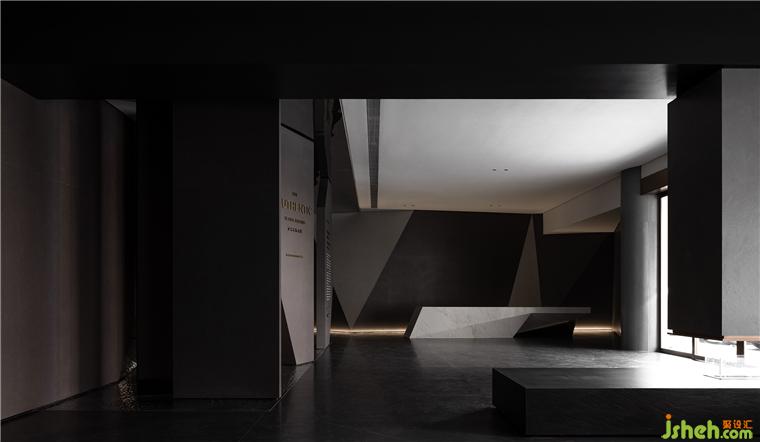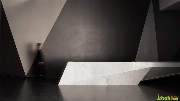 大堂以斜形切割重新構(gòu)建巖板展示空間,擺脫建筑原有的橫平豎直方式,巖板展廳設(shè)計(jì)塑造一種類似于“菱境”般的空間狀態(tài)。菱形切割是鉆石的加工方式,代表了一種極致的加工工藝,菱形切割使每個(gè)塊面都呈現(xiàn)出不同的受光狀態(tài),展現(xiàn)了獨(dú)特的幾何之美。