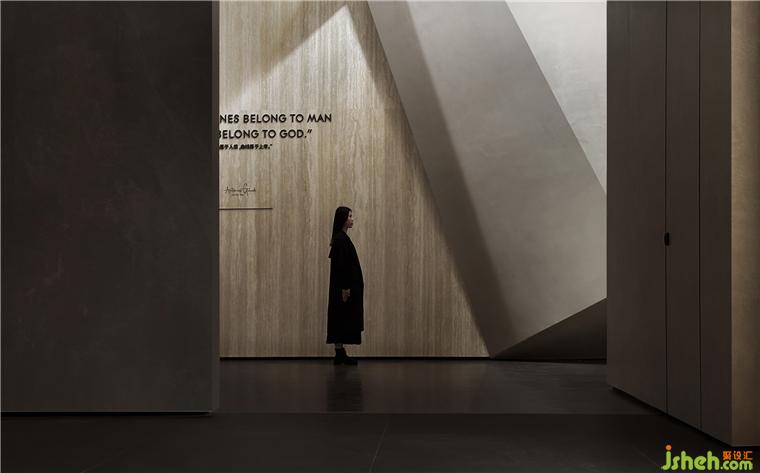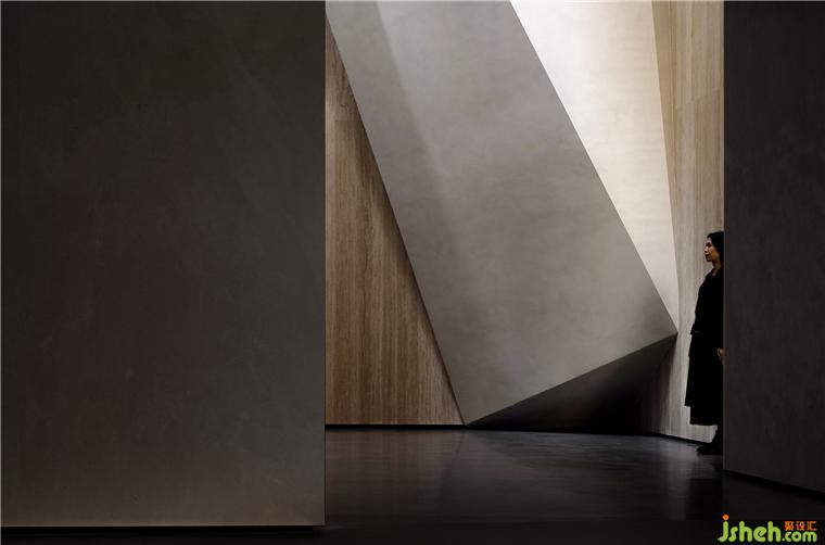 通過各種不同比例的斜形去切割空間形態(tài),將不同的體塊進(jìn)行拆解和重組,用幾何構(gòu)成的語言建構(gòu)成交錯(cuò)而又充滿矛盾的空間狀態(tài),這里不再是傳統(tǒng)的材料展廳,它更像是一個(gè)立體畫廊,一個(gè)由記憶碎片拼接而成的非現(xiàn)實(shí)空間。