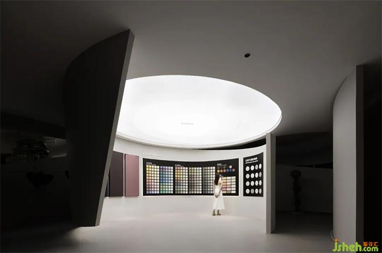 在展廳的大堂領域,一組絢麗的圓形彩色亞克力燈片宛如星辰點綴。燈光如詩,穿越彩色的亞克力燈片,輕輕撫摸過墻面和地面,把空間幻化成夢幻的彩色宇宙。這一巧妙的設計,如同旋律繞梁,不僅在視覺上演奏出動人的音符,更賦予了展廳獨特的靈魂和氣質,進一步詩化了涂料展品的主旋律和特色。