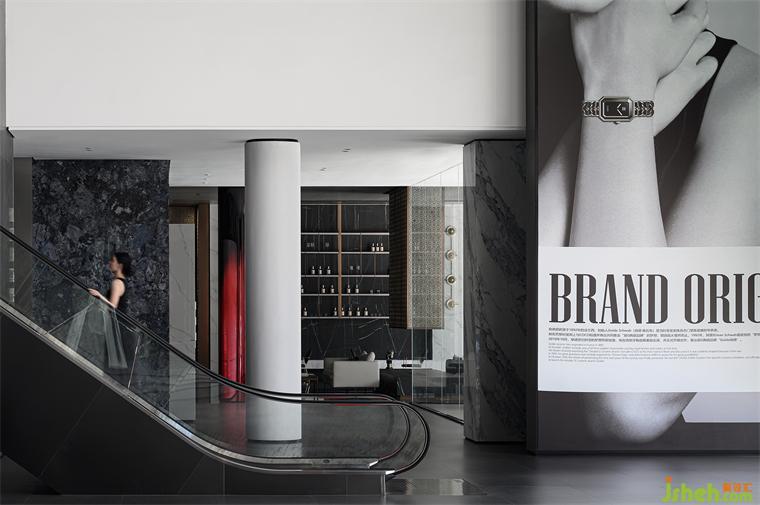 設(shè)計(jì)師將體塊疊加在形象背景墻上,多層次的體塊穿插關(guān)系,暗含力量的空間節(jié)奏和秩序,也成為了空間場域的記憶線索。精致的絲印藝術(shù)玻璃背景墻以及藍(lán)色奢石的接待臺,都凸顯出品牌既時(shí)尚又雅奢的品牌定位,深灰色的啞光質(zhì)感產(chǎn)品和白色的大理石作為主調(diào),使空間沉穩(wěn)而不失優(yōu)雅。