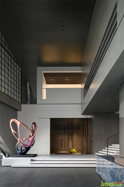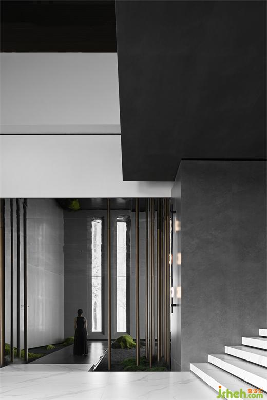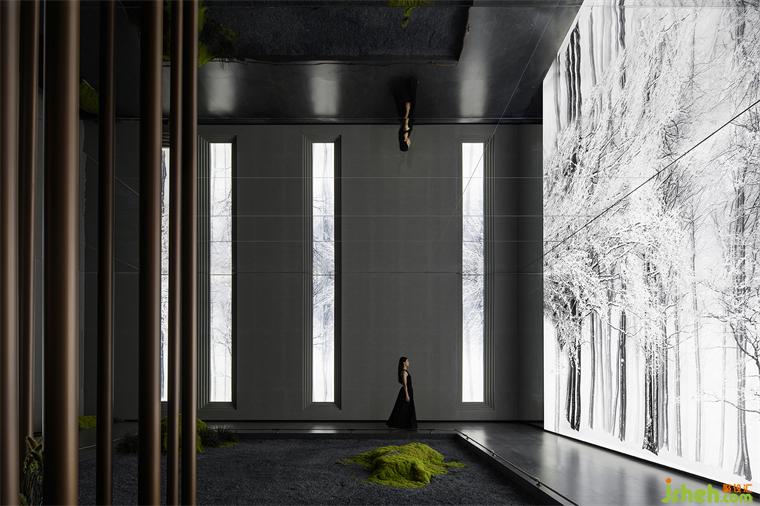 穿過大堂盡頭,恍若進(jìn)入一片森林秘境,無限的延展與放飛想象,讓身心合一,感受心靈與自然親密接觸。瓷磚總部設(shè)計(jì)師在這里用虛實(shí)相加的手法營(yíng)造了一片森林秘境,用粗細(xì)不同的不銹鋼圓柱做成叢林,在叢林中設(shè)置造霧器使云霧彌漫開來,和虛擬的霧凇林相互映襯,穿過叢林的一條U形棧道增加了進(jìn)入該空間的儀式感,