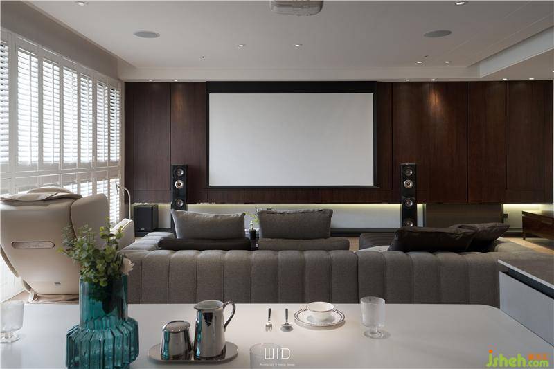 客廳空間始用了投影幕來代替電視機,以隱藏的手法將視聽影音設(shè)備化於無形,當(dāng)天花板投影布幕自動垂降,客廳瞬間成為高級的家庭劇院,準(zhǔn)備好爆米花和啤酒,看球賽、聽音樂或選部想看很久的電影,慵懶的躺在沙發(fā)上,那將會是一件多么享受的事!在家也能擁有專業(yè)、舒適的視聽環(huán)境。
